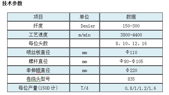 滌綸FDY紡絲機(jī):設(shè)備主要用于生產(chǎn)滌綸FDY全牽伸絲,該絲主要用于服裝、床上用品、裝飾用品、產(chǎn)業(yè)用的土工布、過濾布等。